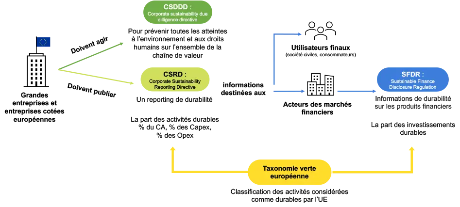 A la taxonomie s’ajoute la CSRD (Corporate Sustainability Reporting Directive) qui vise à harmoniser et à fiabiliser le reporting extra-financier des entreprises, la CSDDD (Corporate Sustainability due diligence directive) sur le devoir de vigilence et le règlement SFDR (Sustainable Finance Disclosure Regulation) qui concernent les produits financiers.
