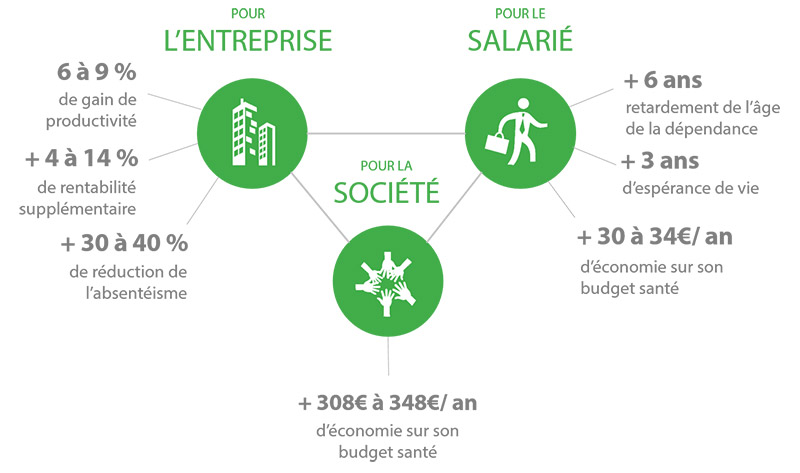 - L’impact économique pour le collaborateur, qui est en meilleure forme et réduit son budget santé ;